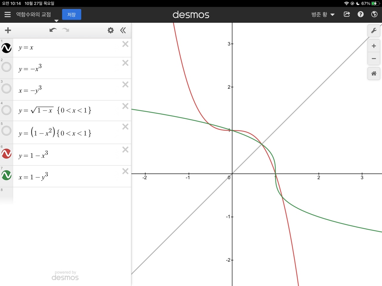 빨강(원래함수) 초록(역함수) 로 구분